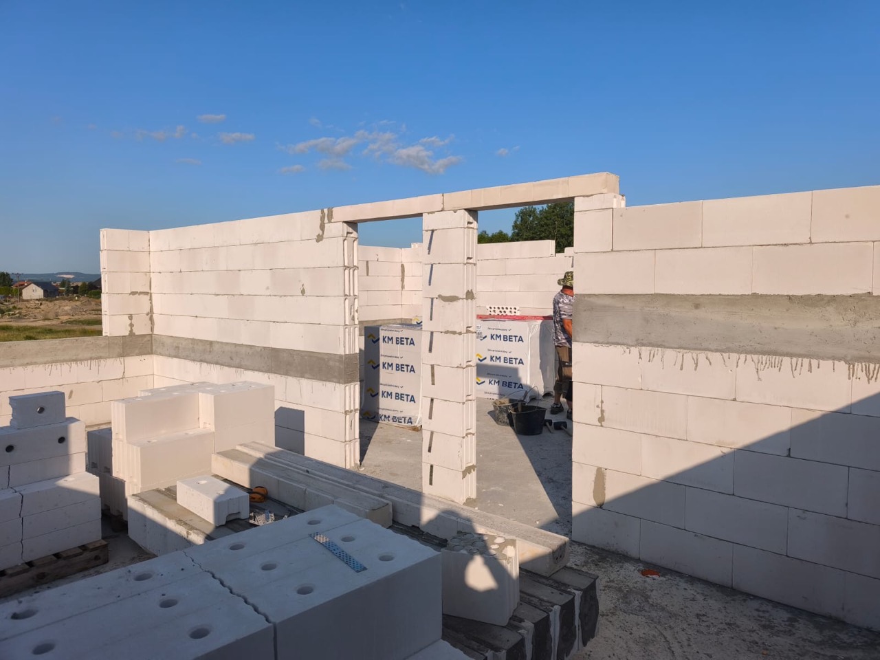 Po dokončení stropu se pokračuje zděním druhého podlaží a ztužujícím věncem podle projektové dokumentace.